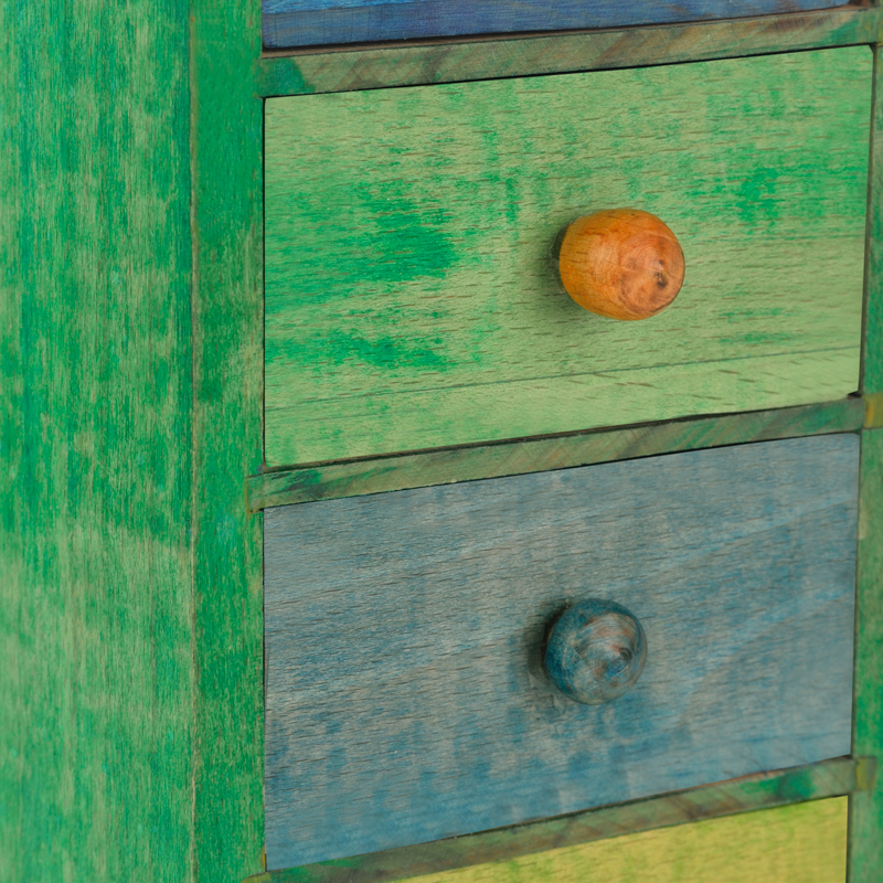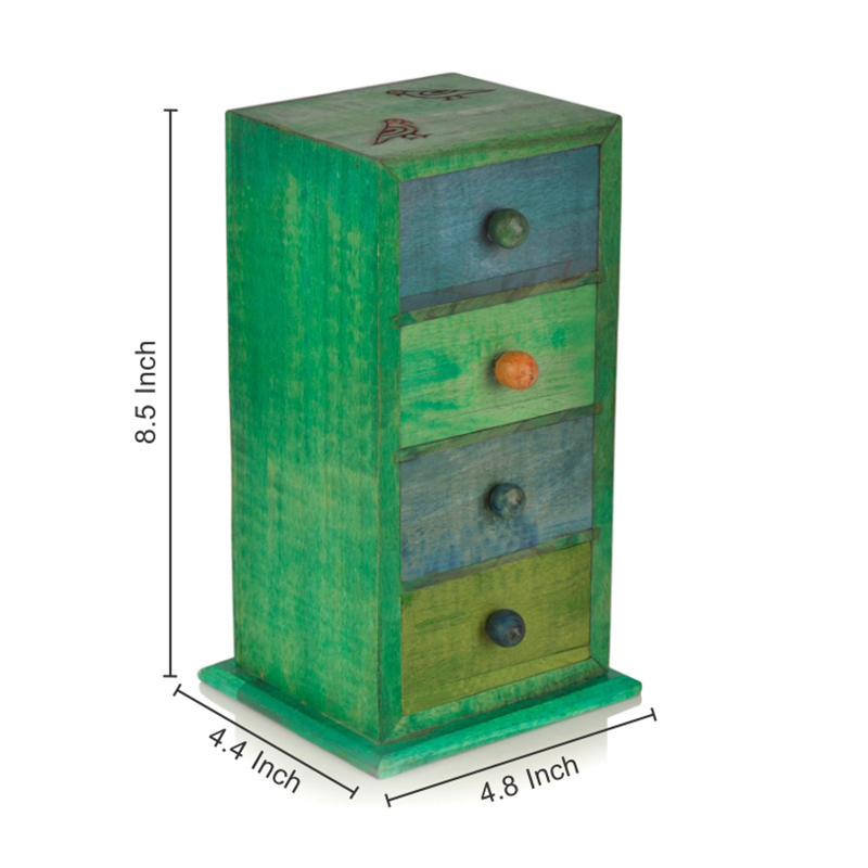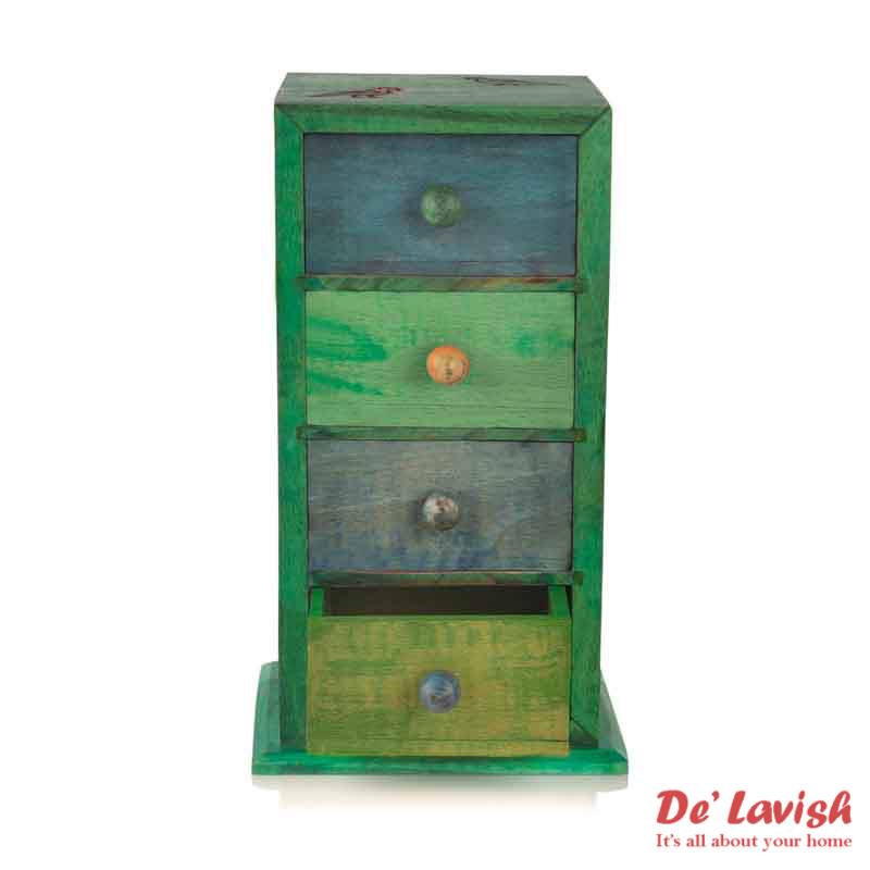 Get this unique vertical woodeen chest drawers to keep your precious jewellery organised in this 4 handcrafted multicoloured drawers. The colour combination of the drawers is adding a unique factor by complementing each other with hues and shades of Blue and green. This multipurpose box can be used to store your knick – knacks and other small items.