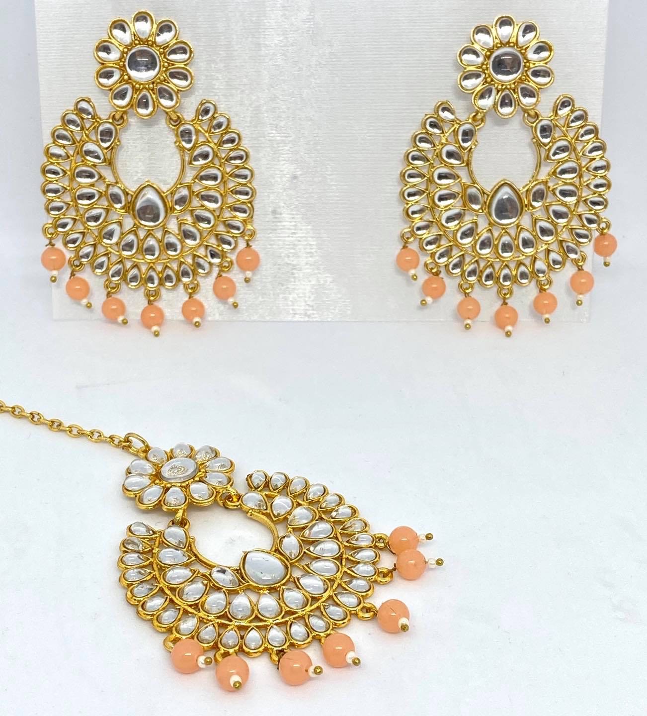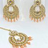 MAANG TIKKA SET WITH PEACH PEARLS AND WITH GOLD BASED.